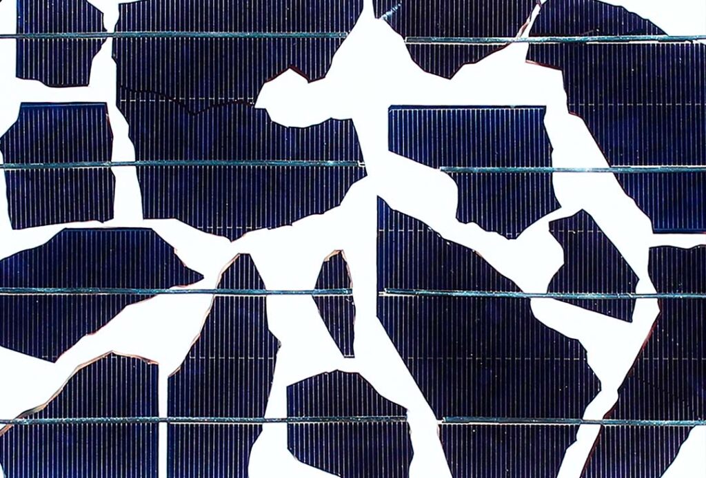 Photovoltaic modules are typically produced using a thermo-chemical lamination process. The solar cells and the conductive elements are encapsulated in an EVA (Ethylene Vinyl Acetate) layer. They are protected from humidity and mechanical influences by a front glass and a back sheet foil. Each layer can be adapted for design purposes: The front glass layer can be replaced with textured, printed, or coated glass or foils of different colours and transparency. This way, it is possible to alter or completely hide the solar cells’ otherwise rather technical appearance. Furthermore, as shown in this exhibition, PV cells today exist in multiple colours and shapes and can be cut depending on individual needs and requirements. Their placement and the density within the module represent an additional design possibility.