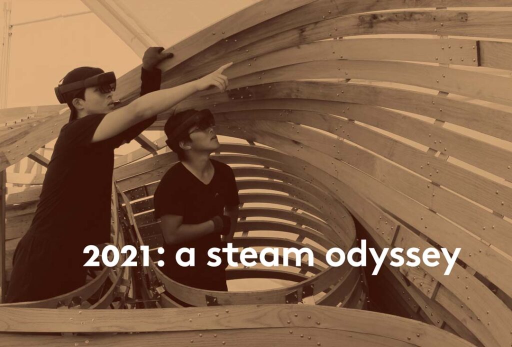 2021: A Steam Odyssey is conceptualized around the notion that making in AR reinvigorates traditional craftsmanship by augmenting hand and material skills with the precision and formal possibilities of digital modeling—occupying the territory between purely automated, exclusively robotically-driven fabrication and highly crafted processes requiring human labor.