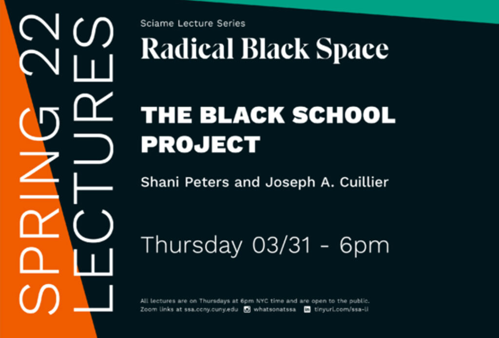 This lecture is part of the 2022 Spring Sciame Lecture Series, themed “Radical Black Space.” All lectures will be presented via Zoom and held on Thursdays at 6pm NYC time.